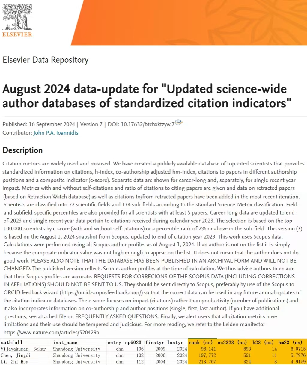 近日,美国斯坦福大学JohnP.A. Ioannidis教授团队和爱思唯尔数据库(ElsevierData Repository)发布了第七版《2023年全球前2%顶尖科学家榜单》(World’s Top 2% Scientists)。榜单以Scopus数据库为依据,基于引用次数、H因子、HM因子等6种指标,根据其“终身影响力”(1960-2023)和“年度影响力”,从22个领域和176个子领域,近700万名科学家中遴选出世界排名前2%的科学家。TapTap点点博士后Sekar Vijayakumar、陈景帝教授、李志华教授入选该榜单。