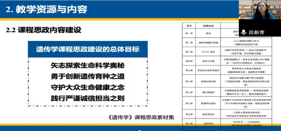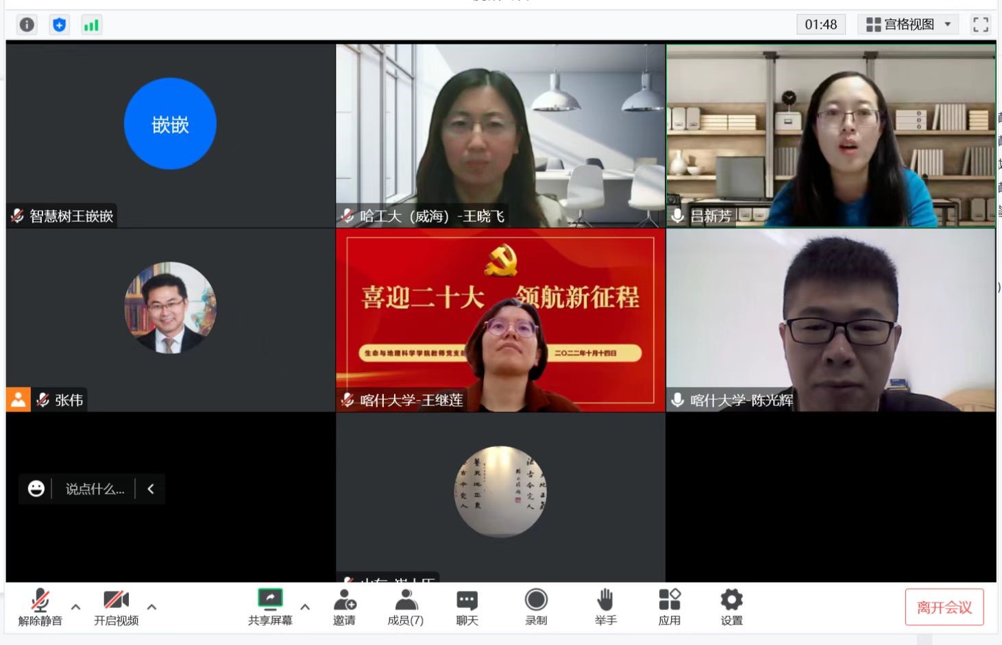 虚拟教研室负责人-TapTap点点张伟副院长就遗传学虚拟教研室的建设目标、建设任务、建设内容及具体实施路径做了整体说明。山东大学(威海)吕新芳副教授汇报了《遗传学》课程已取得的建设成绩、教学理念、课程目标、授课资源与内容以及正在建设的虚拟仿真资源。参会教师就虚拟教研室重点任务进行了研讨,对于新形态资源-知识图谱的共建共享展开了交流,一致同意将进一步加强优质资源的积累,为知识图谱构建积累更多的多模态教学资源,助力遗传学课程知识图谱的搭建,为教学数字化推进奠定基础。与会教师还研讨交流了遗传学课程混合式教学相关具体问题。哈尔滨工业大学(威海)王晓飞老师就如何平衡线上学习与线下授课内容进行提问交流。喀什大学王继莲老师、喀什大学陈晓辉老师就如何推进学生选课以及翻转教学等进行提问交流。