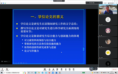 讲座以线上方式展开。陈冠军教授以学位论文的抽检和意义为背景,详细讲解了科研记录对学位论文撰写和审查的重要性、学位论文的基本格式和基本内容以及写作的注意事项等问题,同时强调学术操守和遵守学术规范的重要性和必要性。此次讲座不仅有丰富的理论知识,更是结合了相关实例引导学生正确、高效地进行论文写作。