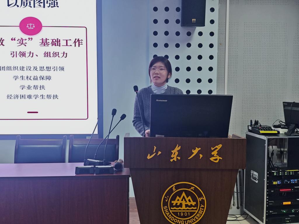 宿美玲介绍了训练营的内容安排,包括理论学习、实践锻炼、专题交流等多个环节,并将通过多样化的形式,帮助学生干部强化理想信念、提升工作技巧,更好的履职尽责。随后辅导员分别就分管工作向与会学生交流本学期工作重点和计划。宿美玲指出要凝练团委工作亮点和特色,加强品牌建设,优化“启航——远航”学生骨干培养体系;肖玲部署了心理健康教育系列活动;翟俊伟就学业帮扶、学风建设、科创引领等进行部署;韩玉洁介绍了学生会文体活动方案和社团改革方案;张馨强调了宣传素材的全流程管理规范;程诺就社会实践工作规范化、内涵化发展进行强调。