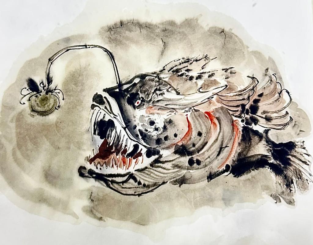 在3月18日至30日的线上作品征集期,学生们踊跃参与、积极投稿,协会共收到208份优秀作品,其中包含绘画类作品61份,诗歌类作品76份,故事类作品71份。学生们用笔触勾勒对海洋动物的关爱,用文字描绘人与动物和平共处的美好场景。经过3月31日至4月12日的评选阶段,多份作品脱颖而出。其中,获奖作品《毒灯鱼》灵感源于将中国传统水墨画与海洋生物融合,通过灯笼鱼的变异形态警示海洋保护的重要性与紧迫性。诗歌《念奴娇·沧溟志》采用念奴娇的词牌名,上阕写今日海洋的衰败,下阕追忆往昔海洋美景,采用“蜃市鲛宫”等典故在古今对比中表达“保护海洋和自然”的主题,以“清泪”结尾,表达作者对当下海洋生态的忧虑。故事《海的守望:龙影下的约定》通过海龙王的传说,表达了人与海洋、文化与自然之间的深厚联系,呼吁人们尊重自然、守护环境。