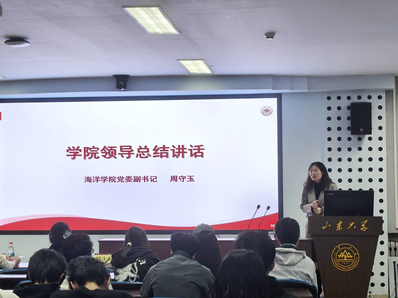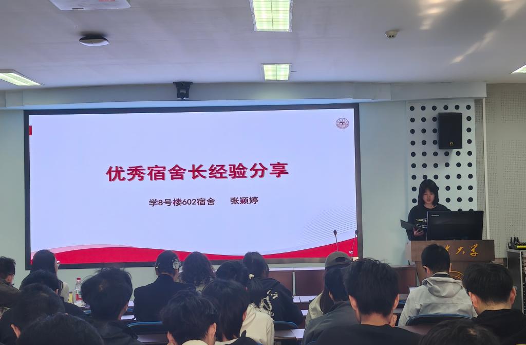 会议伊始,韩玉洁以“宿舍长的角色与责任”为主题,要求全体宿舍长明晰并贯彻执行各类安全管理规定,及时纠正并消除隐患,并及时关注舍友的学习、心理等各方面状态;随后,她结合官方通报的校园安全数据与真实案例,再次强调了最新版《山东大学学生住宿管理规定(修订)》相关条款,明确禁止使用违禁电器、私拉电线及人走未断电等行为,要求宿舍长通过常态化排查切实维护宿舍消防安全,并做好反诈防骗提醒,树立第一责任人意识,真正将口号落实到行动。2021级海洋生物学专业董小瑜分享其宿舍成员通过班委与宿舍长协同带动、定期交流学习规划、互助备考等举措,取得两人保研清华大学,两人保研山东大学,一人考研西北农林科技大学的优异成绩。8号楼602宿舍长张颖婷介绍了“3+1轮值制度”与弹性调整机制,强调制度与关怀并重的管理理念,该宿舍通过明确分工、定期大扫除及安全自查,连续九周保持卫生评分90分以上。2022级学20号宿舍楼楼委鲁晓枫通报了20号楼卫生检查情况,指出堆放杂物、吸烟等违规行为,并对卫生评分标准进行说明。会议设置互动环节,通过现场答题形式强化电器使用规范、卫生扣分细则等规定,提升了学生的参与度。