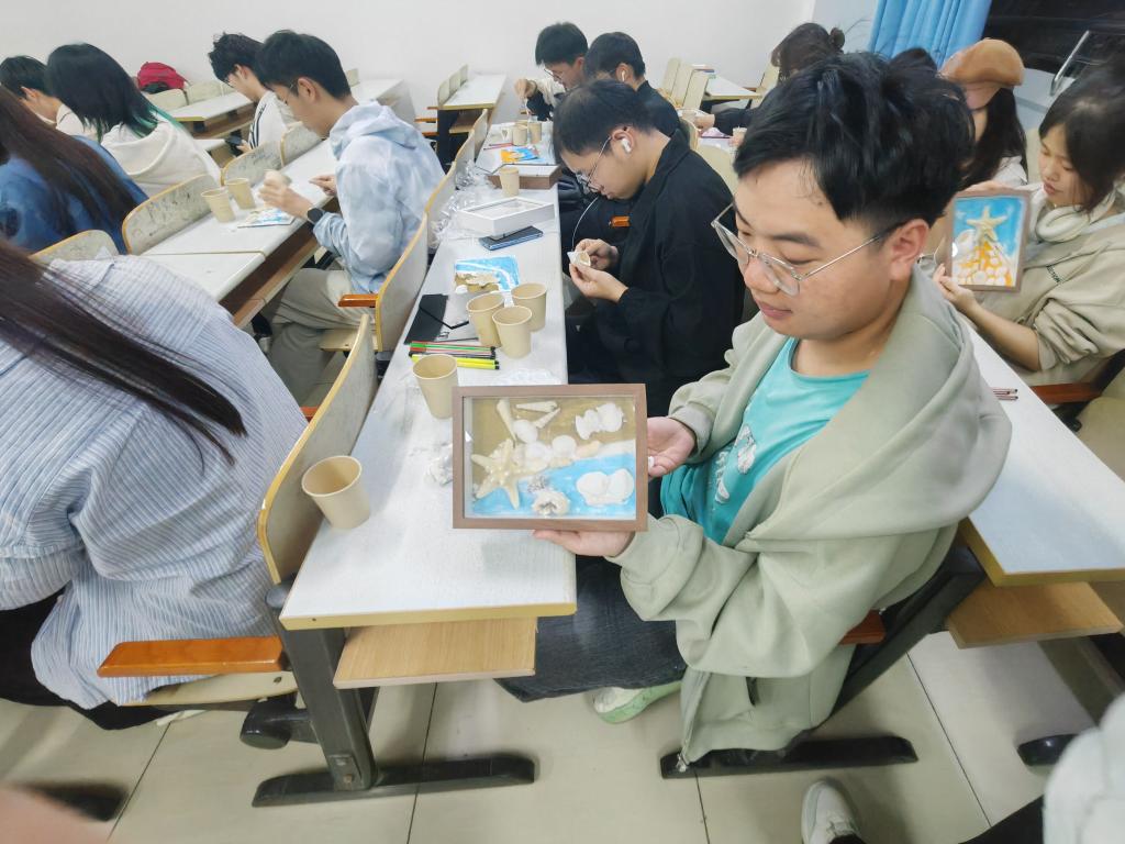 活动伊始,文艺部志愿者丁可通过一段视频向在场学生展示了当前海洋环境面临的主要污染问题。视频生动形象地展示了塑料污染对海洋生态系统的破坏性影响,强调了污染治理的紧迫性和必要性。随后,丁可介绍了环保艺术的基本概念和发展脉络,展示了以海洋保护为主题的经典装饰画作品。通过对作品构图、色彩运用和材料选择的介绍,她阐述了如何利用贝壳、海星的天然纹理来制作优秀作品、传递环保理念,并通过实操环节带领在场学生亲手制作海洋主题环保装饰画。参与学生表示,此次活动不仅提升了他们的艺术实践能力,更让他们深刻地认识到海洋生态保护的现实意义。未来,他们将更加关注环保议题,并在日常生活中践行可持续发展理念。