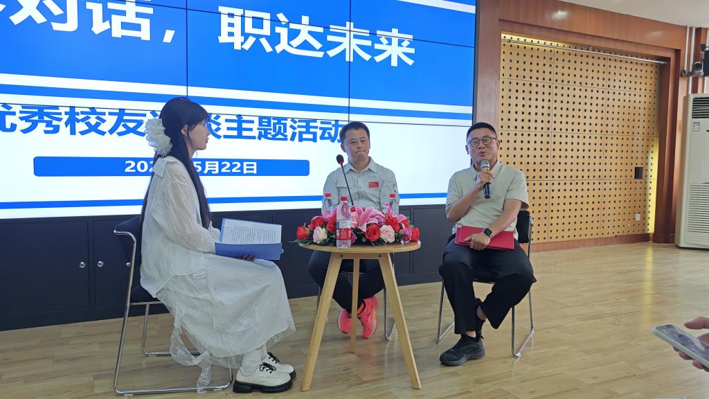 访谈伊始,两位校友分享了“最难忘的校园经历”,拉近了与现场参与学生的距离。牟剑锋提出,科研经历中师生协作的学术氛围为其职业方向奠定基础;刘一新提及了学生干部工作经历中师生资源支持对自身统筹能力的塑造。两位校友的讲述让在场学生感受到,校园生活的点滴积累是未来职业发展的基石。针对“在校学习对求职的帮助”,牟剑锋指出,专业知识是职场竞争的基础,学习能力的培养同样不可或缺;刘一新强调,即便岗位与专业存在差异,逻辑思维与学习能力仍是职业发展的关键。他建议在校生系统提升学习能力,以应对职场挑战。除此之外,两位校友还分享了他们在求职期间的决策经验、职业生涯中的工作内容与成就故事,指出除夯实自身专业能力外,学生也应善用校内资源拓展兴趣领域,提升综合竞争力。