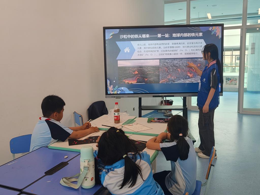 课堂中,志愿者以情景模拟的方式引入课程主题,通过讨论潮间带污染案例、设计“保护沙滩生态”标语等环节,引导学生们反思人类活动对海洋环境的影响;通过展示丰富的贝壳标本、细腻的沙粒显微样本以及生动的潮间带生物图片,带领学生们观察贝壳纹理、沙粒形态,结合动画演示深入浅出地讲解了贝壳的种类、贝壳形成的生理机制,以及沙粒的成分来源与地质形成过程等基础知识,直观呈现沙滩生态的科学原理;引导学生们利用磁铁从沙粒中提取含铁矿物,加深对海洋物质循环的认识;模拟“潮池环境”观察贝类闭壳、螃蟹移动等生物行为,让学生们感受潮间带生物的生存环境与适应策略,在“沙滩记忆标本盒”制作中协作构建潮间带微景观,在动手实践中理解生物与环境的依存关系。此外,课程通过互动交流环节促进学生之间彼此学习、共同进步,进一步巩固了学生对海洋生物多样性及生态关系的认识。