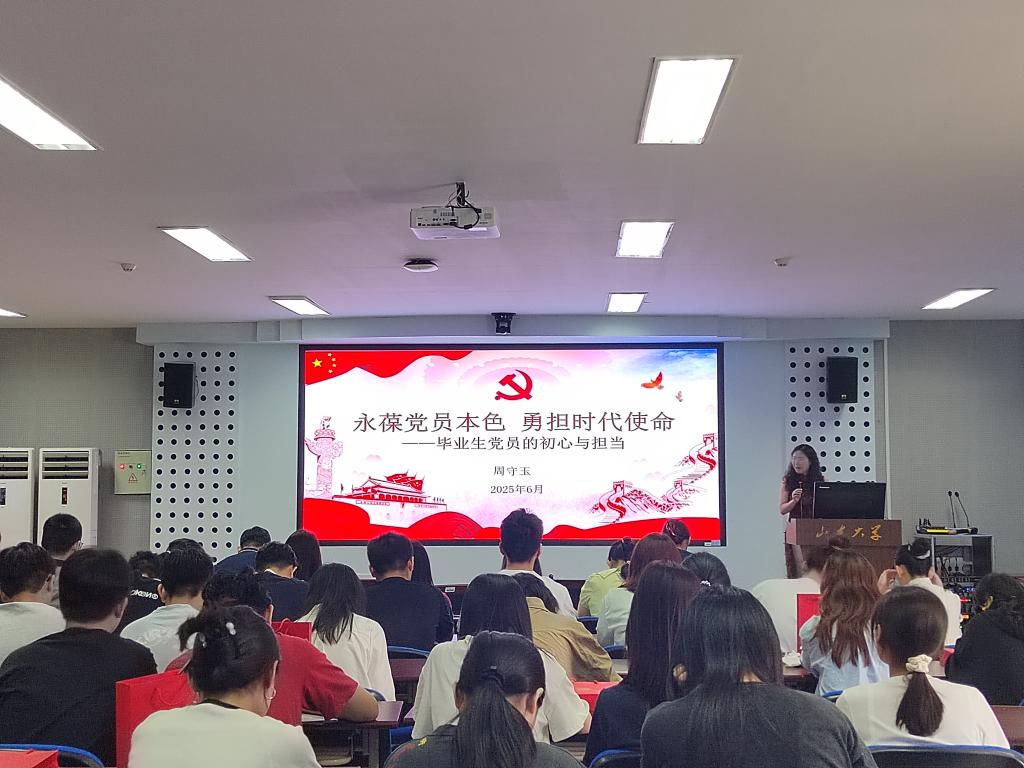 开展一次党课学习。学院党委副书记周守玉以“永葆党员本色,勇担时代使命”为主题开展了党课学习,从毕业生党员的初心和使命角度出发,强调了毕业生党员应该积极参与、勇挑重担、冲锋在前,增强历史责任感和使命感,在强国建设、民族复兴伟业中勇当先锋队、突击队,将理论知识内化于心、外化于行。