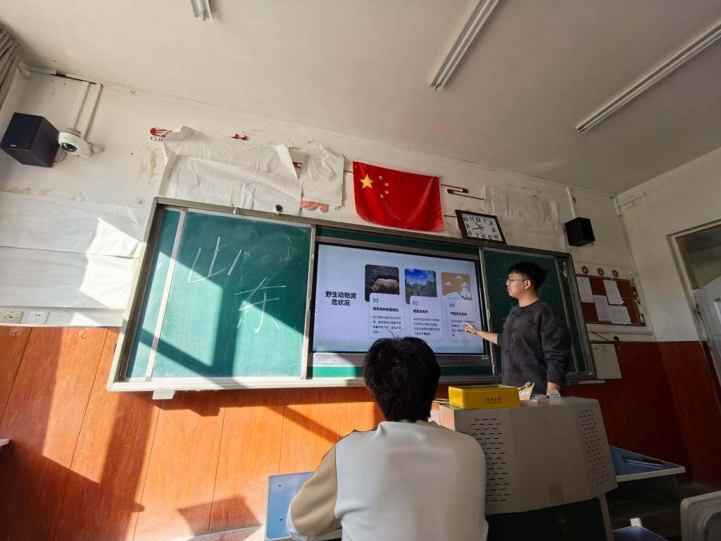 队员刘春炀赴河南省新乡市延津县东街社区实践。他深入自然栖息地,观测动物种类、记录生存状态,系统采集水质、土壤及植被数据,科学评估生态修复对野生动物的影响。同时,通过问卷与访谈,深度调研公众对动物保护及生态建设的认知现状。在内蒙古赤峰市敖汉旗这片融合草原、湿地、森林的生态宝地,队员贾天一于新惠中学开展了生态调研与科普活动。讲座中,贾天一以翔实数据阐述野生动物的濒危状况及生态保护的重要性。在广西壮族自治区桂林市阳朔县书童国际苑,队员邹碧君带领孩子们开启了一场动物探索之旅。志愿者引导孩子们分享感兴趣的动物及其外形习性,寓教于乐,快速激发参与热情。针对生态环境破坏导致动物流离甚至濒危的现状,活动特设“小行动·大守护”低碳生活互动展,鼓励孩子们写下并践行具体的低碳承诺。孩子们郑重的环保诺言为活动画上了圆满句号。