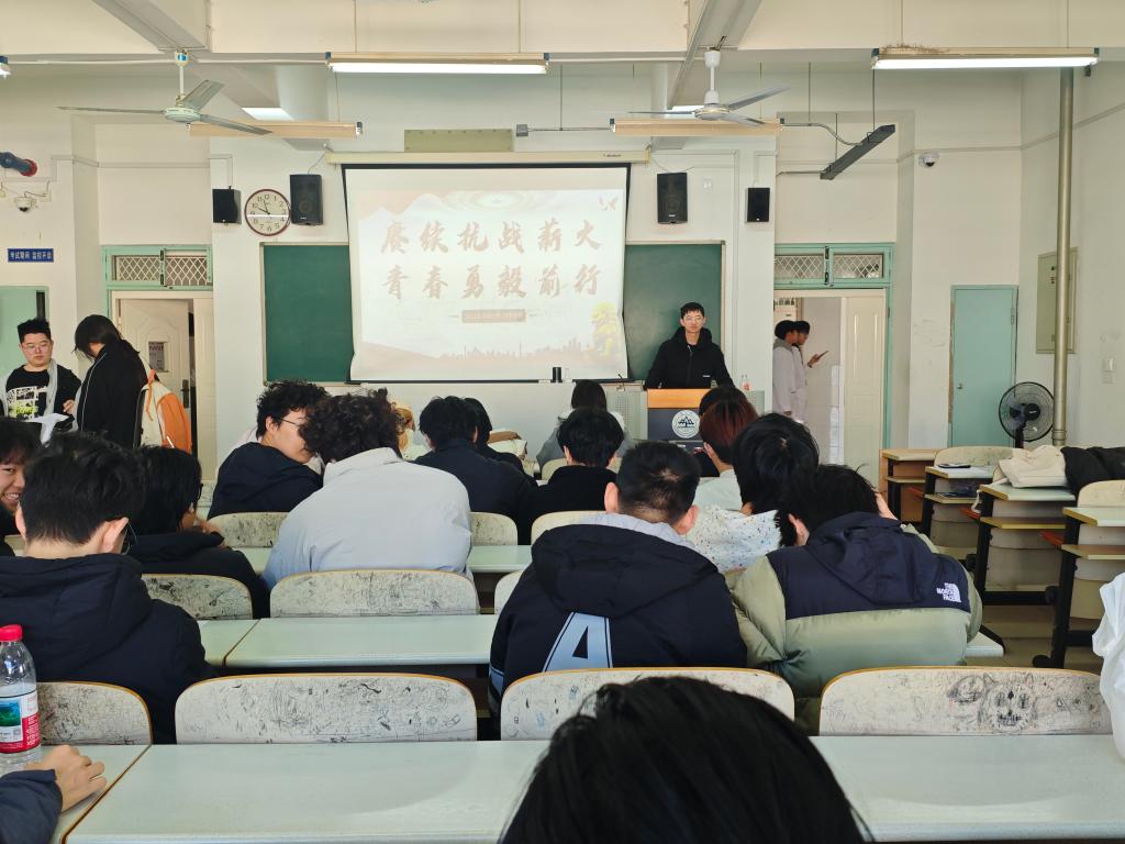 活动伊始,喻春智带领同学们集中学习习近平总书记的重要讲话精神,系统领会抗战的伟大意义、精神内核及弘扬抗战精神、推进民族复兴的实践路径。他指出,抗战胜利是民族复兴的历史转折点,中国共产党在抗战中的中流砥柱作用,以及伟大抗战精神必须代代传承弘扬。随后的感悟交流环节,同学们围绕讲话核心要义和精神实质,结合自身学习生活实际展开交流。同学们聚焦抗战历史与英雄事迹的教育价值,明确新时代青年应深植信仰之基,弘扬以爱国主义为核心的民族精神,将抗战精神转化为攻坚克难的动力。最后,喻春智在总结发言中指出,作为新时代青年,应从民族苦难与牺牲中认识今日成果的来之不易,将个人理想融入党和国家事业,以实干锤炼本领、贡献青春力量。