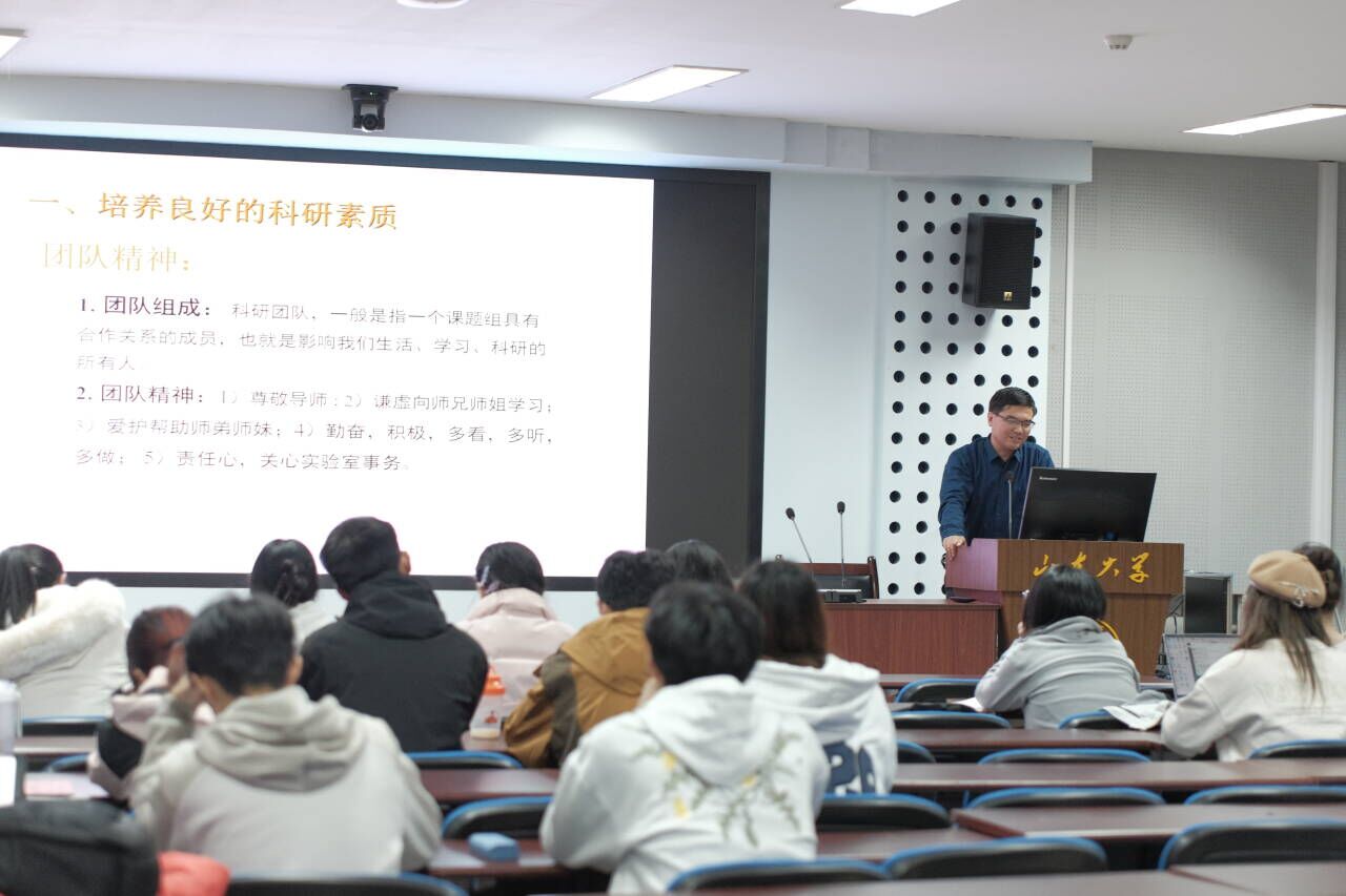 宋淑亮老师针对“研究生生涯及科研规划”展开详细讲解。宋老师以课程学习为切入点,鼓励研究生们夯实专业基础,积极参与课堂讨论,并与导师和同门保持密切交流,为后续科研工作筑牢根基。他指出,研究生阶段应全面学习前沿理论和研究方法,了解国内外研究现状和趋势,不断拓宽学术视野,在此基础上设计实验方案和研究框架。同时,宋老师特别强调,积极参与学术会议和研讨会对研究生而言至关重要,这是展示科研成果、获取同行反馈、拓宽人脉网络的宝贵途径。在论文撰写阶段,宋老师通过实例分析,引导研究生要严谨对待数据处理和分析,确保论证充分、逻辑严密。此外,要创造学习的主动性、能动性,培养良好的科研素养;选择课题要兼顾创新性和实用性,以推动学术进步和社会应用。最后,与会研究生向宋老师就科研学术中的困惑与挑战展开了深入探讨,大家纷纷表示讲座内容受益匪浅。
